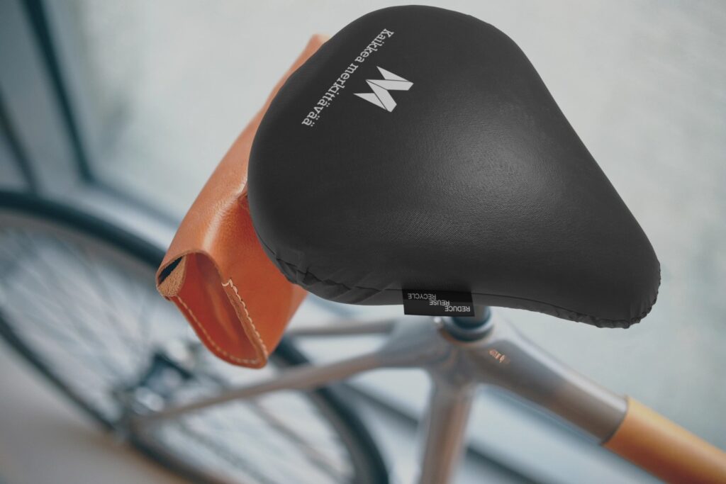 Kierrätetystä PET-materiaalista valmistettu uudelleenkäytettävä ja kevyt polkupyörän satulanpäällinen, jossa on kuminauha koon säätämistä varten.