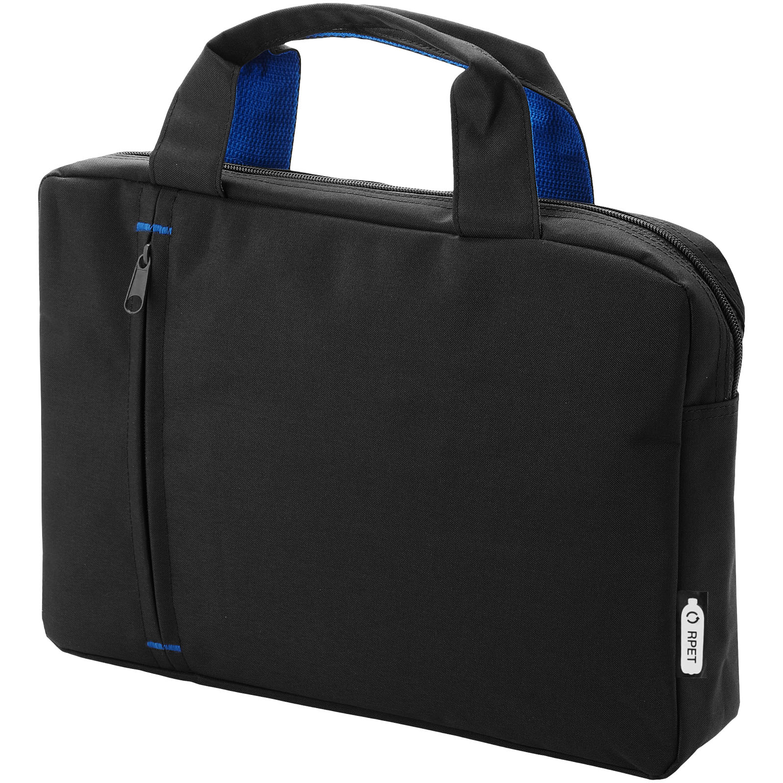 Kierrätetystä PET-muovista valmistettu konferenssilaukku, jossa on vetoketjullinen päälokero ja edessä vetoketjutasku, vahvistetut kantokahvat päällä ja trendikkäät kontrastivärit.