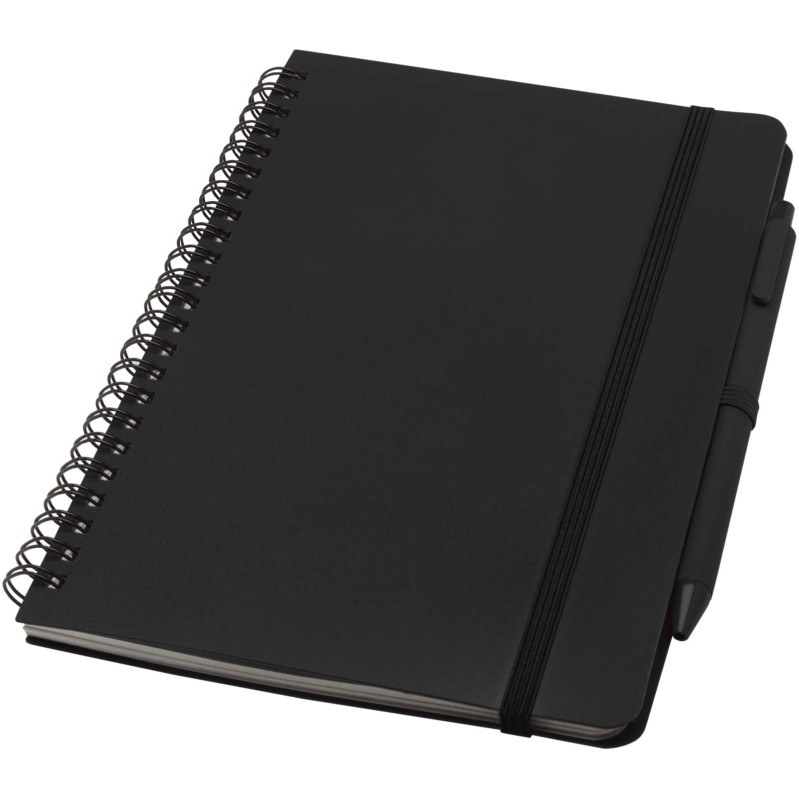 Kovakantinen Thalaasa A5-muistivihko on valmistettu kierrätetystä merimuovista ja siinä on 80 viiva-arkkia 70 g/m²:n kermanväristä paperia. Muistikirjassa on pyöristetyt kulmat, kuminauhasuljin ja kynälenkki. Kuulakärkikynä on myös valmistettu kierrätetystä merimuovista, musta muste. Kirjoituspituus: 1000 metriä. Kärjen paksuus: 1,0 mm.